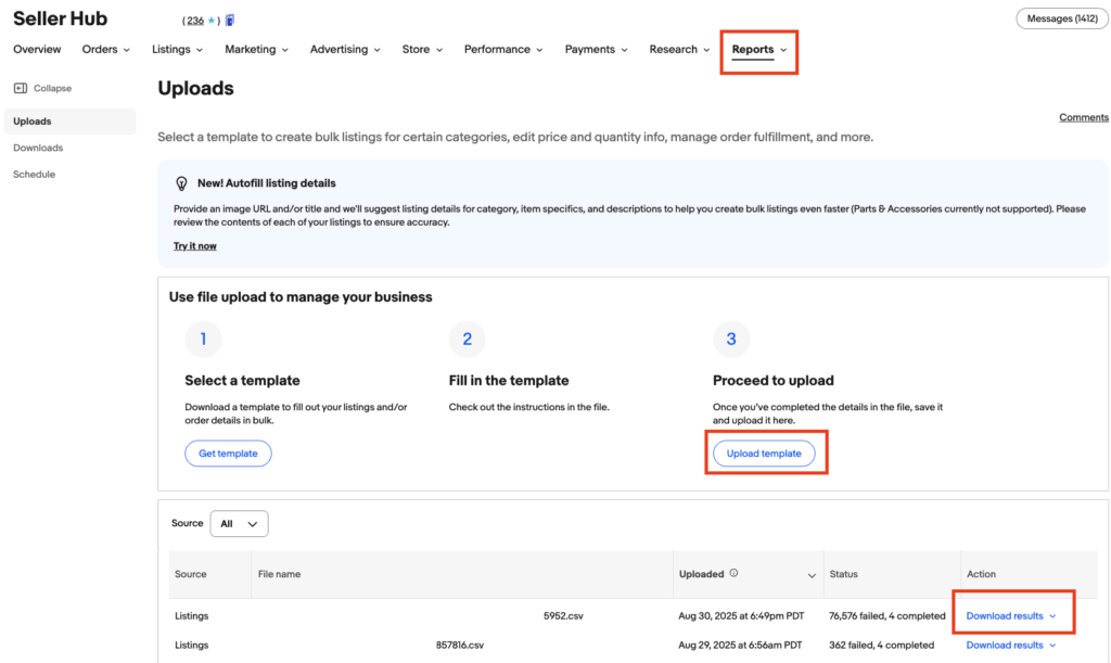 「failed」は出品に失敗した件数、「completed」は成功した件数です。