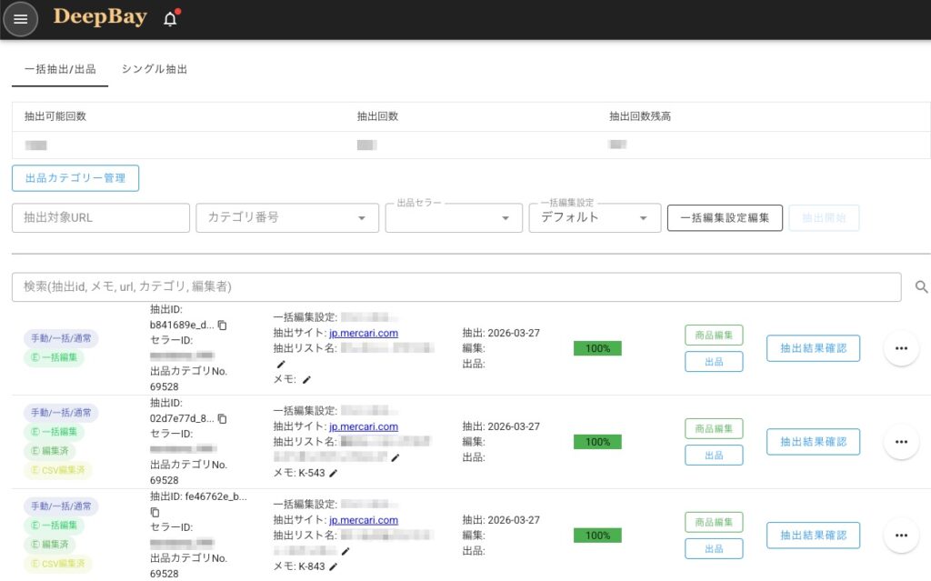 進捗バーが100%になると商品編集が可能になります。 - 抽出完了後、商品編集を行います。
