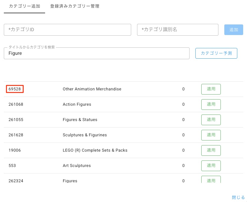 該当カテゴリを選び、「適用」をクリックとカテゴリIDが反映されます。 - カテゴリIDとカテゴリ識別名を入力し、追加します。