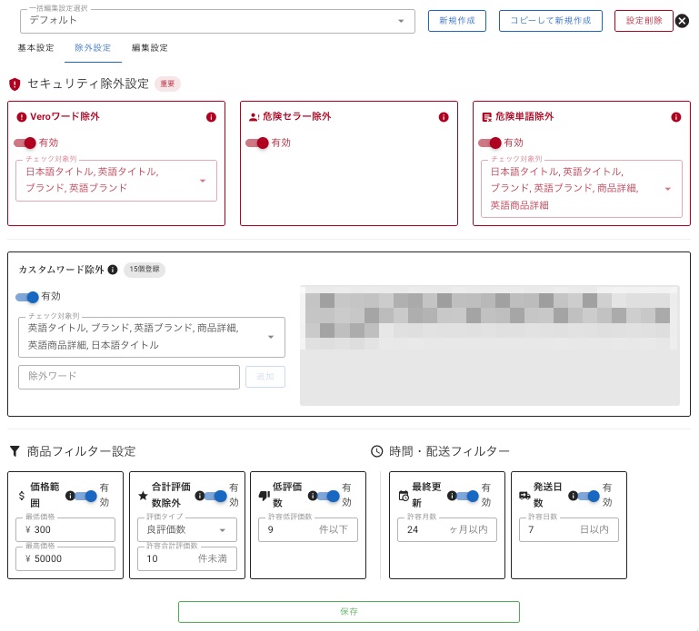 - Veroワード除外、危険セラー、危険単語(抽出危険設定と連動します)